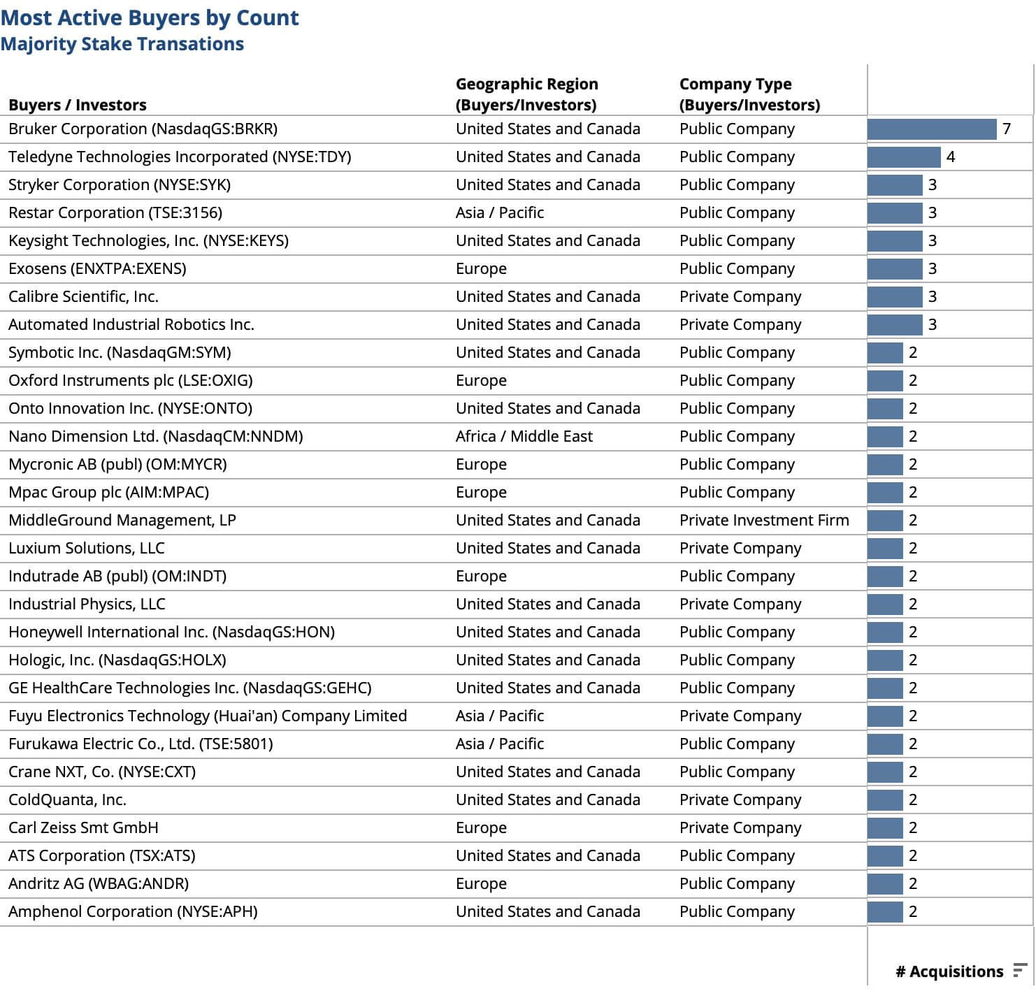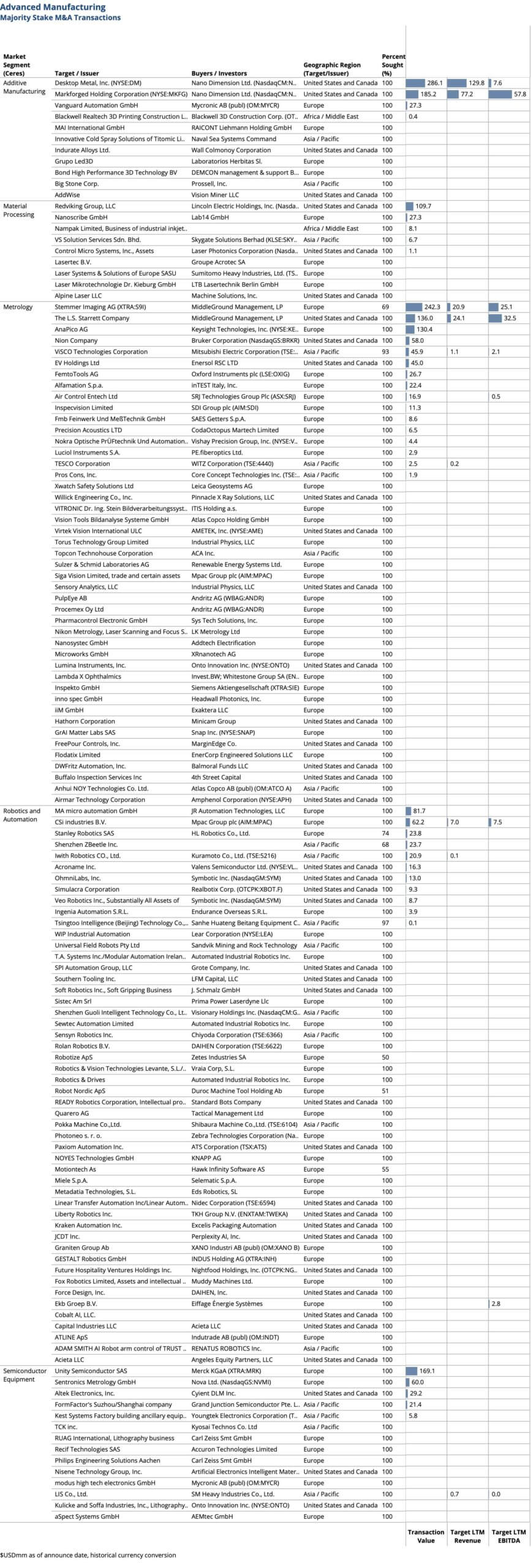 The largest transactions in the sector are: 56% of Mimasu Semiconductor Industry Co., Ltd., supplier of semiconductor materials and metrology equipment, acquired by Shin Etsu Chemical Co., Ltd. for $379M; Desktop Metal, Inc., provider of additive manufacturing technologies, acquired by Nano Dimension Ltd. (31.7x $7.6M EBITDA); 96% of Stemmer Imaging AG, provider of machine vision subsystems, acquired by MiddleGround Management, LP in three separate transactions for a total of $330M (12x to 17x EBITDA).