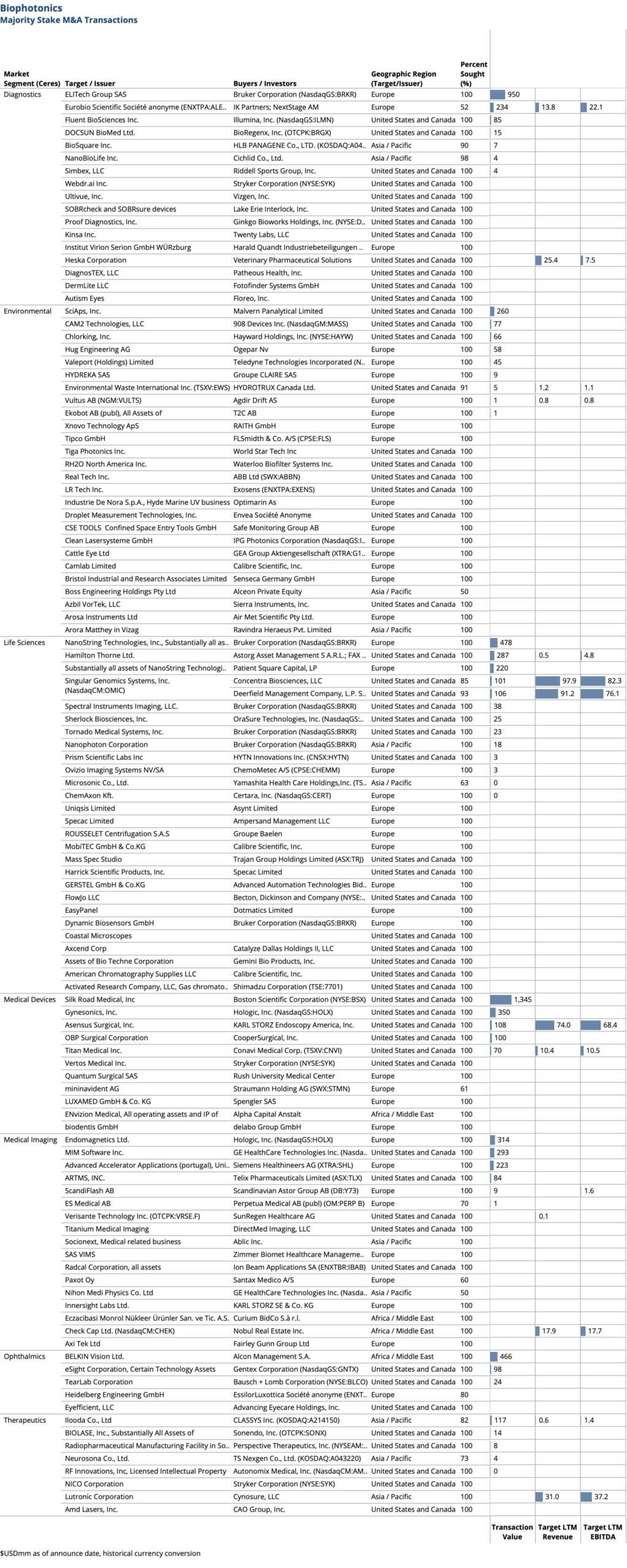 Announced January 2025 and not included in analysis presented, but evidence of a return of the robust Biophotonics market segment, Boston Scientific Corporation acquires Bolt Medical, Inc., supplier of laser-based intravascular lithotripsy devices with Implied Enterprise Value of $820M.