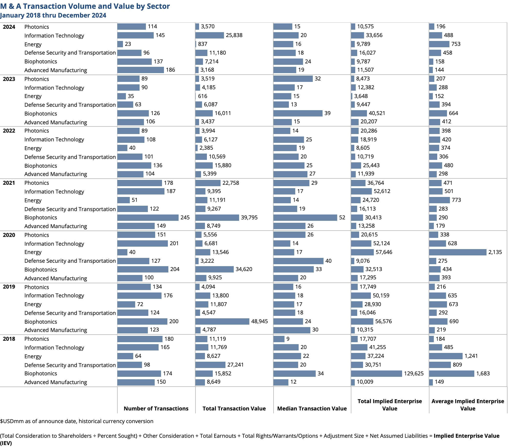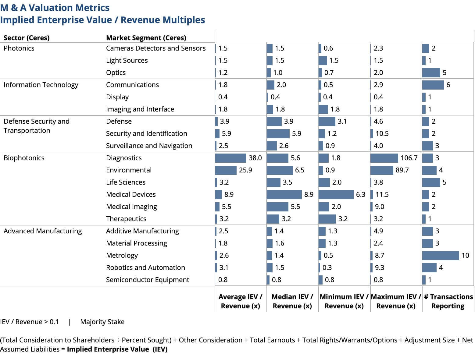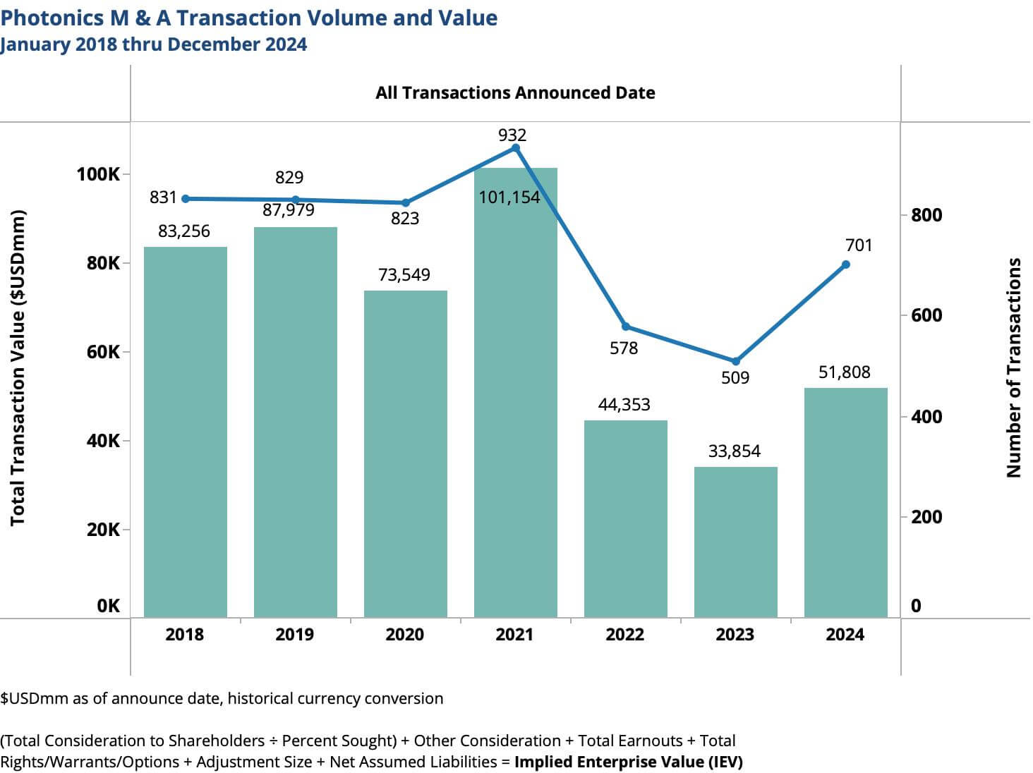CERES research includes M&A transactions announced between January 1 and December 31, 2024 for targets employing photonics technologies. Activity and valuations are analyzed by market segments. Values are in $US at historical exchange rates. Implied Enterprise Value (IEV) is defined as the total consideration to shareholders (adjusted for % acquired) plus earn-outs plus rights/warrants/options plus size adjustment plus net assumed liabilities.