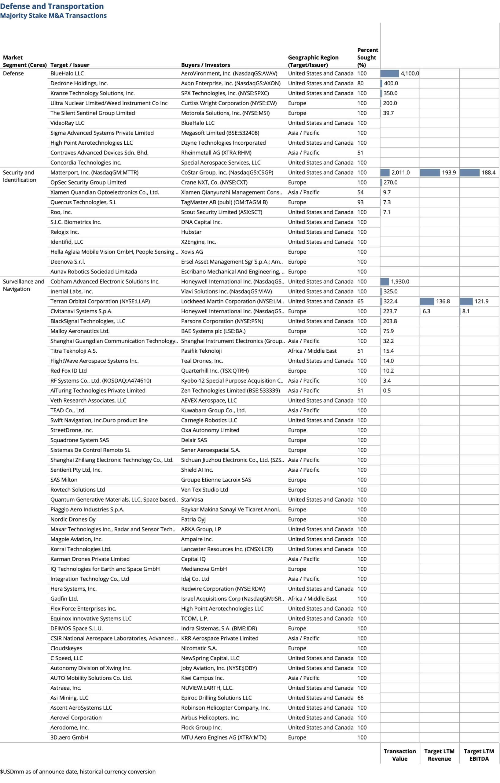 The largest transactions in the Defense, Security and Transportation sector are: BlueHalo LLC, provider of solutions for space superiority, laser directed energy weapons, missile defense, and cyber and intelligence, acquired by AeroVironment, Inc. for $4.1B (4.6x Revenue); Matterport, Inc. , provider of LiDAR sensors, infrared depth sensors and high-resolution photographic imaging, acquired by CoStar Group, Inc. for $2B (10.5x Revenue); and Cobham Advanced Electronic Solutions Inc., supplier of advanced antenna and laser based systems for electronic warfare, radar systems, satellite communications and targeting, acquired by Honeywell International Inc. for $1.9B.