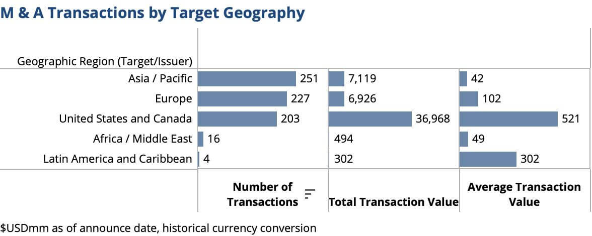 While the largest transactions are with US targets, only one-third of all targets are US. Market leaders and financial sponsors in China, Europe and India are also very acquisitive.