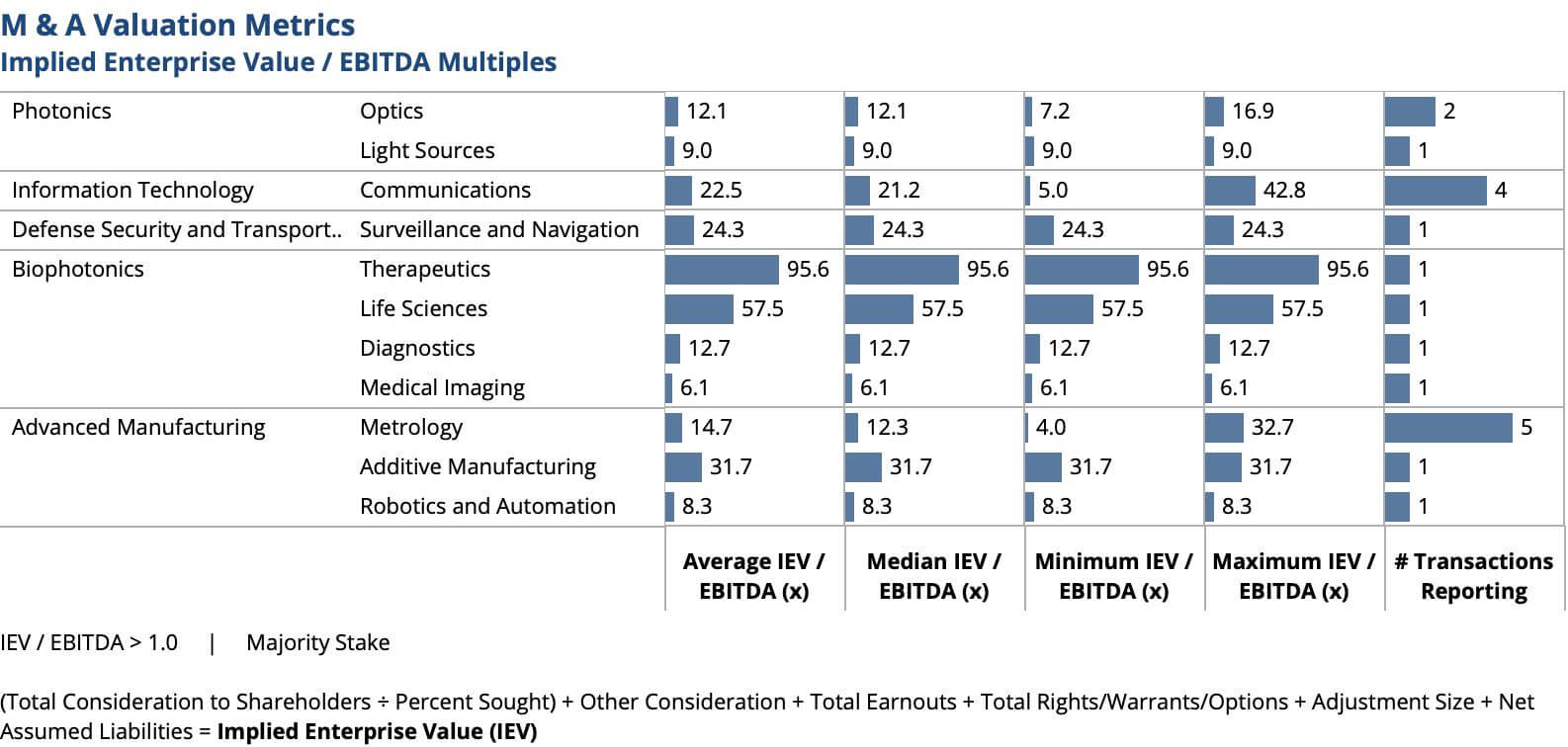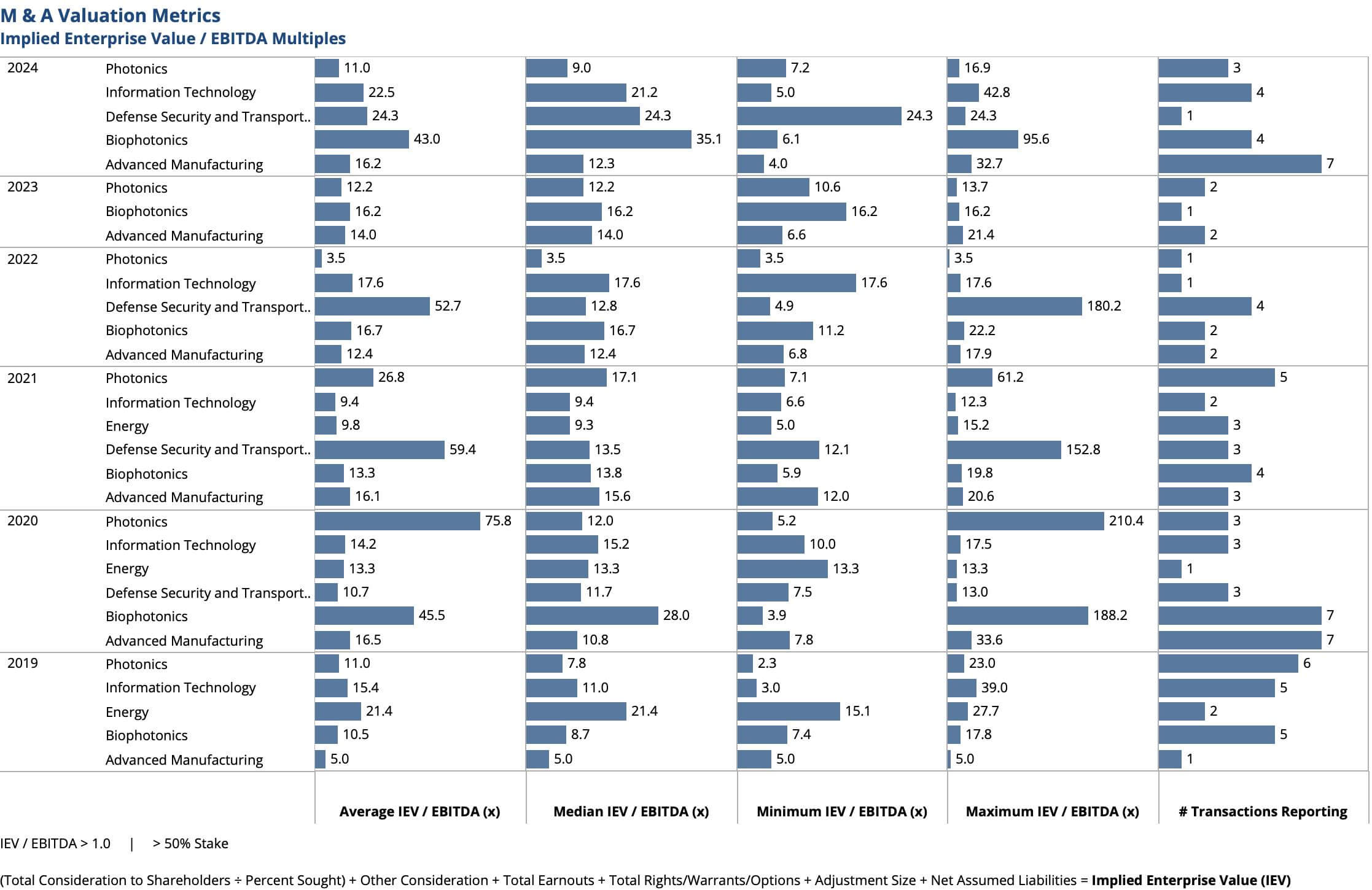 Valuations in photonics M&A remain robust in 2024, with transaction multiples reflecting the sector’s strategic importance. IEV/EBITDA multiples for photonics deals consistently outpace broader market benchmarks, driven by the high demand for specialized capabilities and the scarcity of high-performing assets.