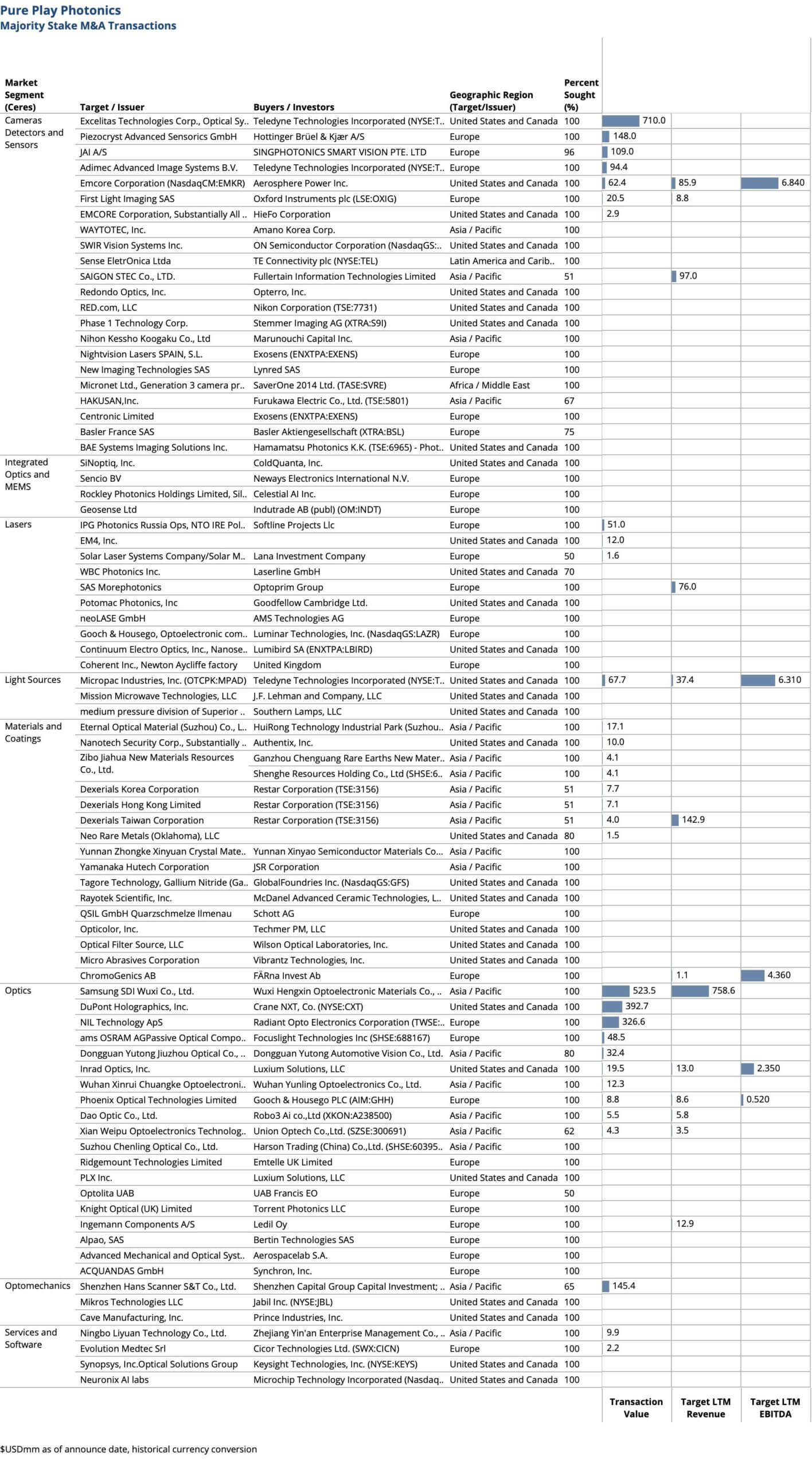 Han’s Laser Technology Industry Group Co., Ltd. sells 65% stake in its optical scanning system solutions business to investors for $145M. Gooch & Housego sells its optoelectronic components and laser modules business to Luminar Technologies, Inc. and divests EM4, Inc., supplier of optoelectronics modules for $12M. The British government acquires struggling Newton Aycliffe factory from Coherent Inc. to secure domestic manufacture of gallium arsenide semiconductors for military technology. Synopsys, Inc. sells its Optical Solutions Group to Keysight Technologies, Inc. to obtain regulatory approval for its proposed $35B acquisition of ANSYS, Inc. IPG Photonics Corporation sells its Russian subsidiary in a management buyout for $51M, finalizing its exit from Russia after imposed Ukraine war trade sanctions. Emcore Corporation continues to restructure with divesture of its discontinued chips business line to HieFo Corporation for $2.9M. ams OSRAM AG sells its Passive Optical Components to Focuslight Technologies Inc. for $49M. Excelitas Technologies Corp. sells select aerospace and defense electronics businesses, including Qioptiq® Optical Systems and Advanced Electronic Systems to Teledyne Technologies Incorporated. Samsung SDI Co., Ltd. divests Samsung SDI Wuxi Co., Ltd., supplier of polarizing display films, for $524M, to focus on high growth markets for next-generation semiconductor materials and OLED technology. Amplitude Technologies SA divests its Continuum nanosecond laser product line to Lumibird SA. Hoya Corporation divests its 46.57% stake in AvanStrate Inc., manufacturer of glass substrates for LCD’s.