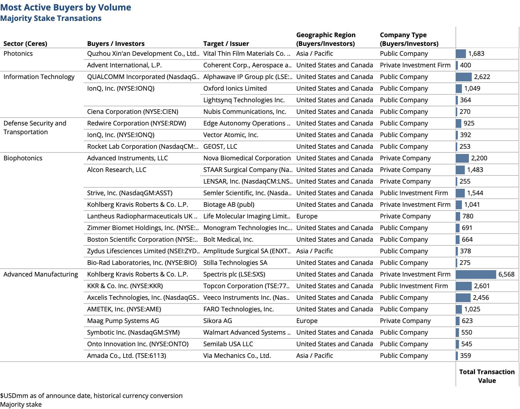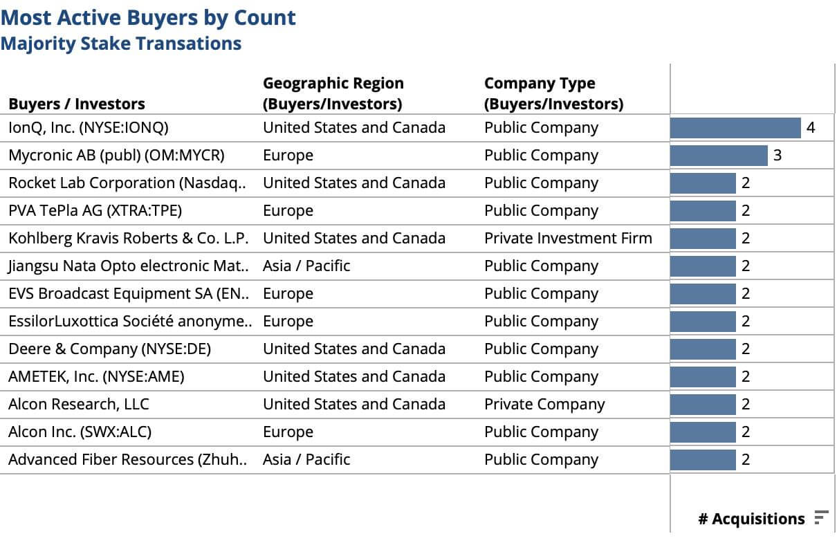 The most active buyer by deal value is middle market U.S. private equity sponsor, Kohlberg Kravis Roberts & Co. L.P. and its Japan affiliate of KKR & Co. Inc. (NYSE:KKR). In the Advanced Manufacturing segment, KKR acquires both Spectris plc, provider of precision measurement solutions, including laser-based particle measuring systems, NIR and Raman spectrometers and X-ray diffraction tools for $6.6B (23.7x $280M EBITDA) and Topcon Corporation, provider of precision ophthalmic instruments like fundus cameras, slit lamps, optical coherence tomography (OCT) systems, autorefractors, tonometers, and ophthalmic lasers; surveying instruments such as 3D laser scanners and rotating and pipe lasers; and precision optical components, for $2.6B (19.6x EBITDA). In the Biophotonics segment, KKR acquires Biotage AB, provider of instruments incorporating UV/Visible absorbance detectors, fiber‑optic UV monitors, spectral detection and spectral analysis software.