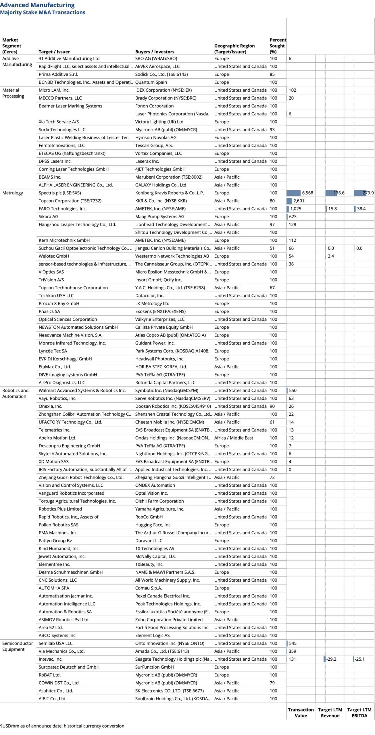 Advanced Manufacturing M&A in 2025 shows a market that is smaller in deal count than the surge years of 2019–2021, yet exceptional in aggregate value. The year’s record total was driven not by broad activity across all segments, but by a handful of outsized Metrology transactions layered on top of steady middle-market deal flow in Robotics/Automation and Semiconductor Equipment. Additive Manufacturing and Material Processing contributed a thinner stream of selective, lower-value deals, but included emblematic transactions that illustrate how photonics-enabled disruption continues to create new acquisition opportunities.
