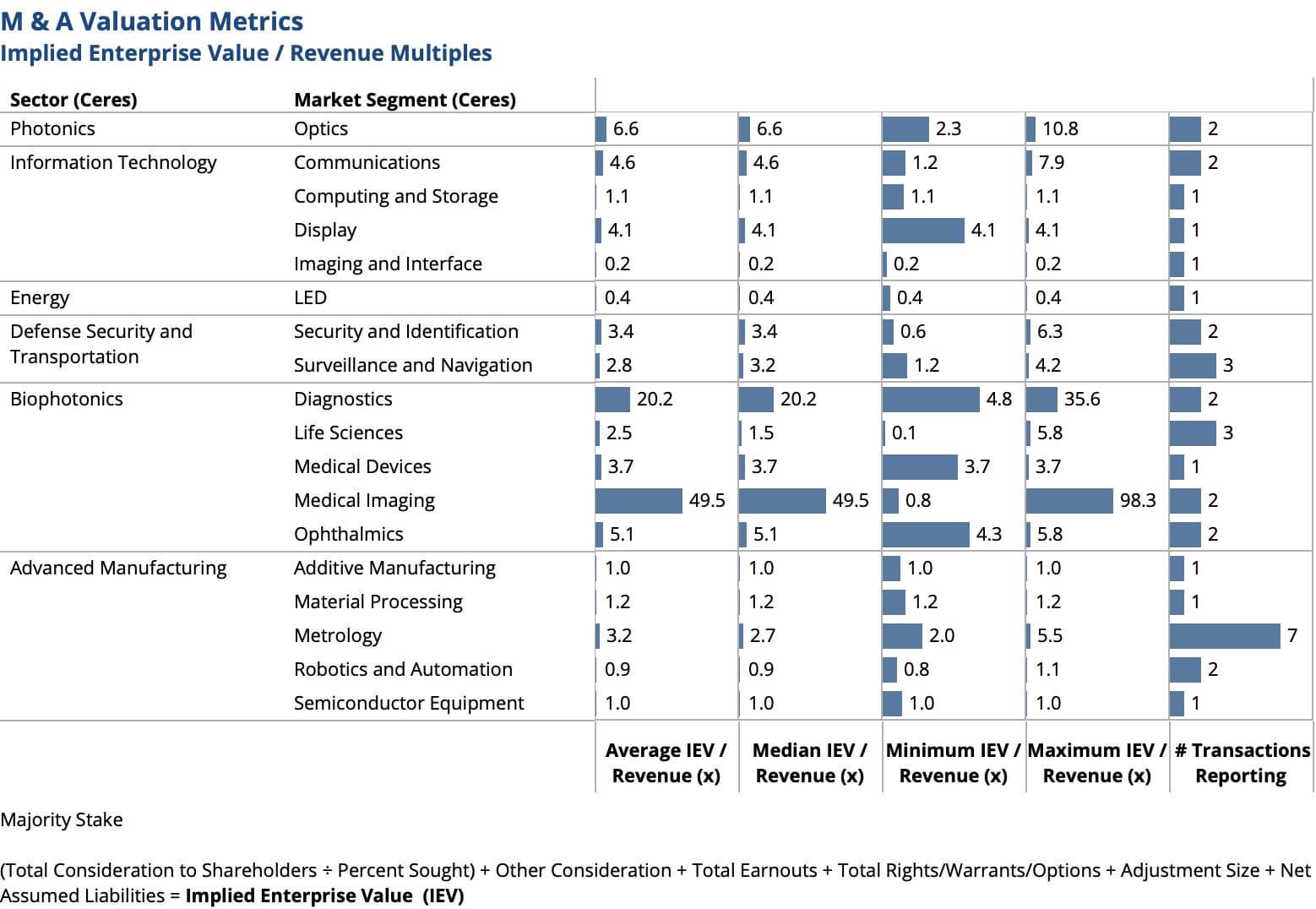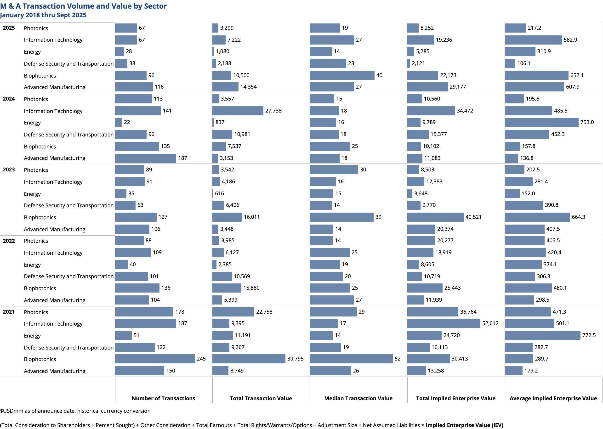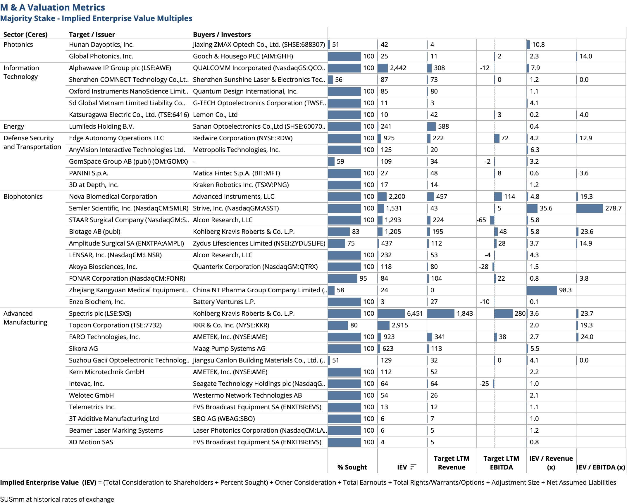 CERES research includes M&A transactions announced between January 1 and September 30, 2025 for targets employing photonics technologies. Activity and valuations are analyzed by market segments. Values are in $US at historical exchange rates. Implied Enterprise Value (IEV) is defined as the total consideration to shareholders (adjusted for % acquired) plus earn-outs plus rights/warrants/options plus size adjustment plus net assumed liabilities.