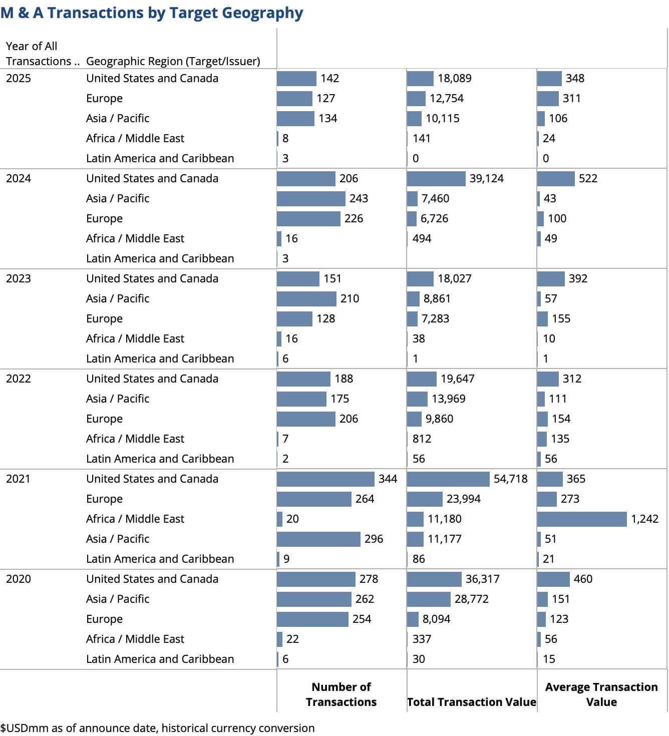 China remains constrained by geopolitical tensions and capital controls, limiting cross-border M&A. Still, outbound capital from the region into the Americas is more than doubled year-to-date, underscoring sustained appetite for U.S. assets despite policy uncertainty.