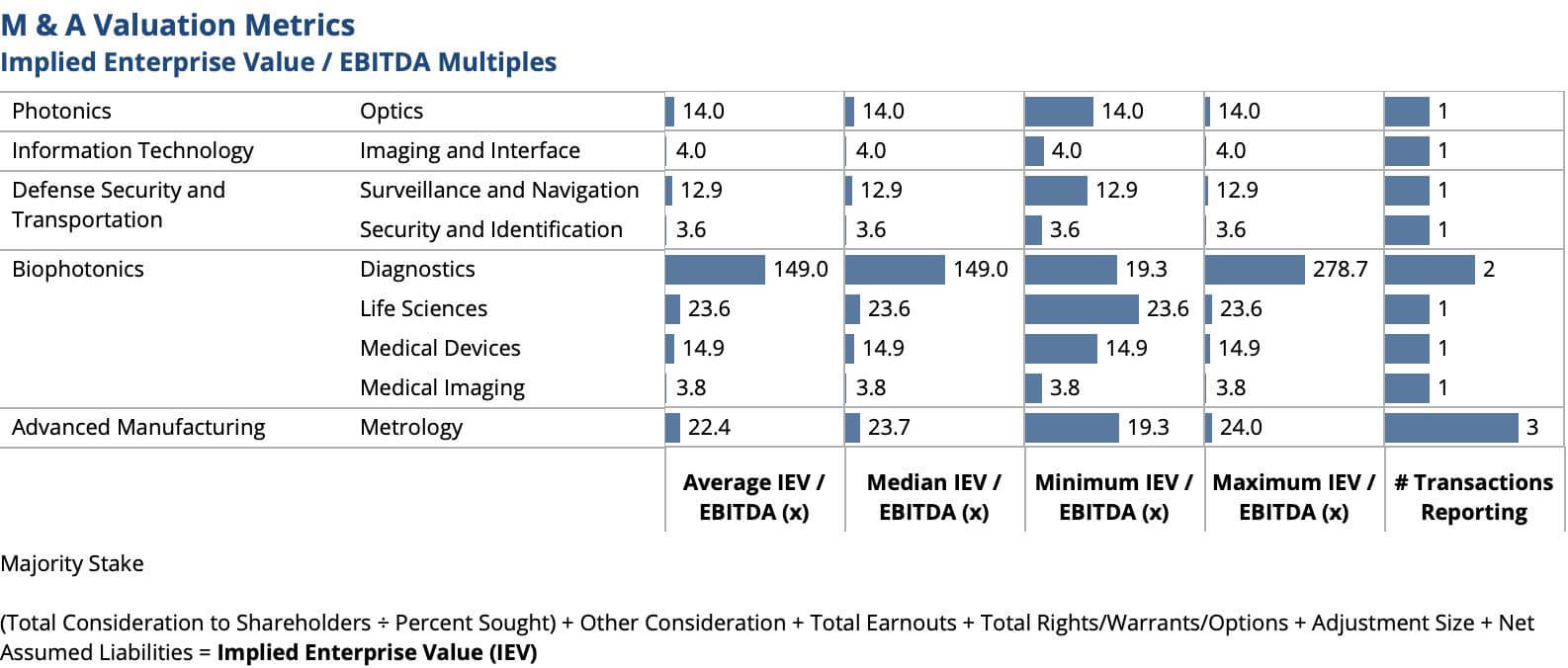 Putting the Semler Scientific and Strive deal aside that is bitcoin driven, leading the pack on IEV/EBITDA multiples for acquisitions of 100% share are: FARO Technologies, Inc., manufacturer of 3D measurement, imaging, and realization, at 24.0x (Advanced Manufacturing, US); Spectris plc, provider of precision measurement solutions, at 23.7x (Advanced Manufacturing, US); and Biotage Ab, provider drug discovery, analytical testing, and water and environmental testing products, at 23.6x (Biophotonics,US).