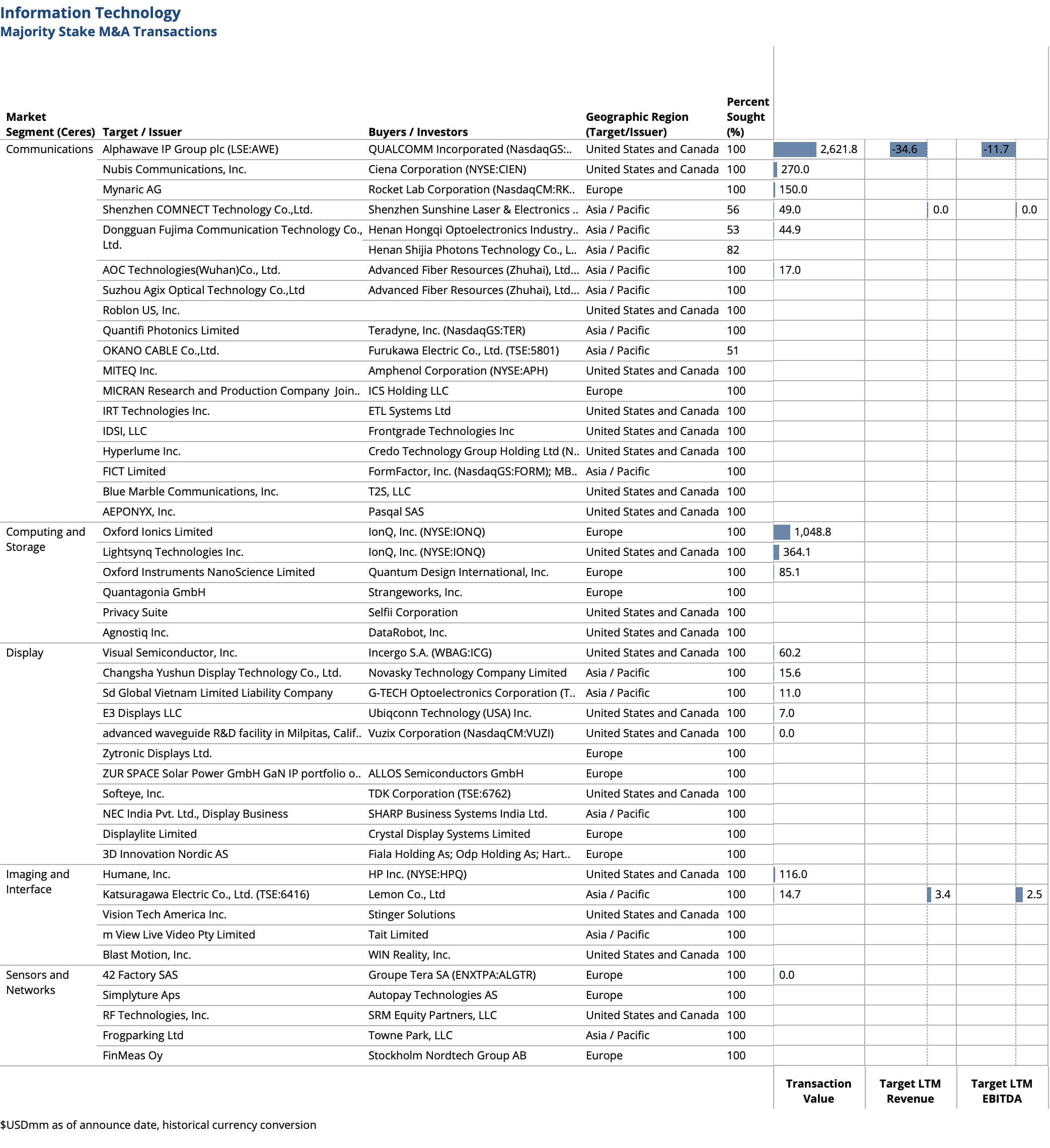 Following are two large transactions– TCL Technology Group Corporation acquisition of Shenzhen China Star Optoelectronics Semiconductor Display Technology Co., Ltd., provider of thin film transistor liquid crystal display devices and organic Light Emitting Diode (OLED) products for $1.6B; IonQ, Inc. acquisition of Oxford Ionics Limited, developer of an advanced quantum computing systems features trapped ion technology, for $1.0B.