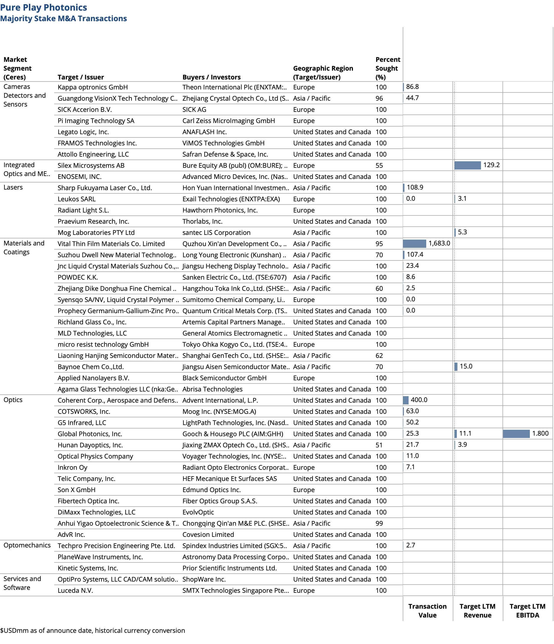 The year’s transactions reflect this imbalance. The largest transaction is Quzhou Xin’an Development Co. agreement to acquire a controlling stake for $1.8B in Vital Thin Film Materials Co. Limited., a leading supplier of sputtering targets and thin-film materials used across semiconductors, displays, and optics. The deal positions Vital as a high-growth platform play, reflecting Chinese financial sponsors’ appetite for foundational photonics manufacturers and underscores Asia’s rising production weight. In contrast the most prominent divestitures and portfolio reshaping moves — Coherent’s sale of its Aerospace & Defense business and Meopta’s sale to G&H — were led by Western players, highlighting where revenue leadership and corporate control remain concentrated.