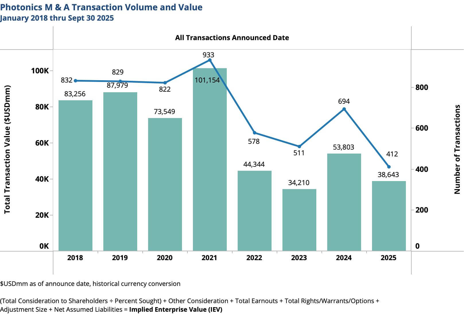 In the first three quarters of 2025, CERES identifies and analyzes 412 transactions involving targets in the photonics industry or in vertical markets where photonics technologies are core differentiators. These transactions represent an aggregate $38.6 billion in Total Transaction Value. For comparison, across the M&A market as a whole during the same period, 33,407 transactions are announced with a combined value of $2.7 trillion.