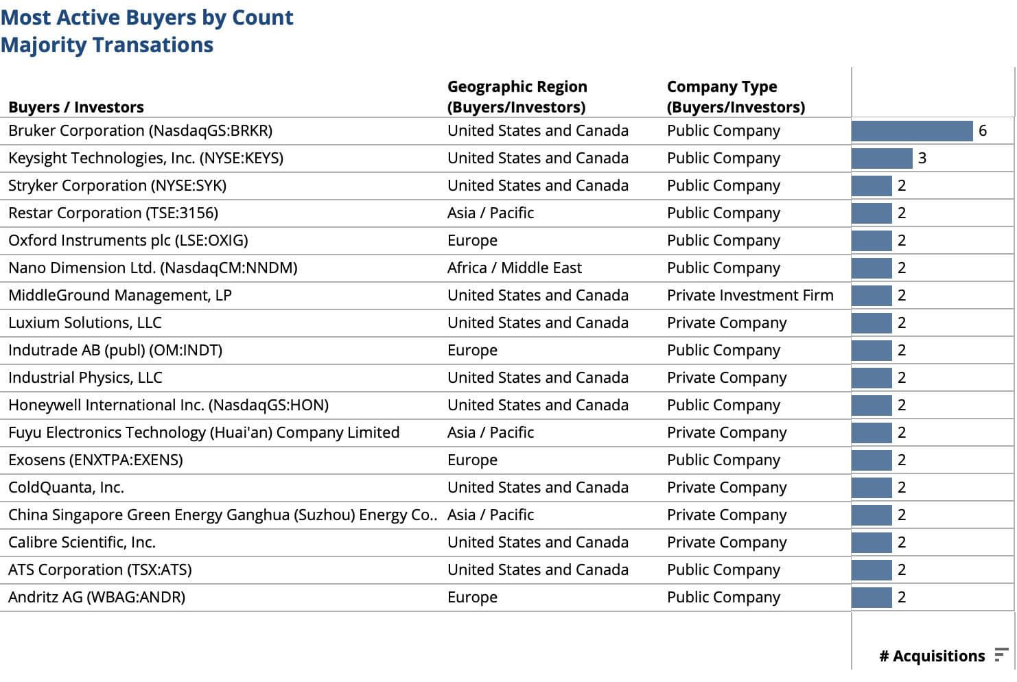 In line with history, the most active buyer is Bruker Corporation who acquires five Biophotonics companies – Nanophoton Corporation, provider of laser microscopes (3.50x $5M revenue); Spectral Instruments Imaging, LLC, provider of preclinical optical systems for bioluminescent, fluorescent and x-ray imaging (3.75x $10M revenue); Tornado Medical Systems, Inc., provider of optical spectrometers for raman spectroscopy and spectral-domain optical coherence tomography; NanoString Technologies, Inc., provider of life science tools for translational research and molecular diagnostics for $393M (2.3x $168M revenue); and ELITech Group SAS, manufacturer of in vitro diagnostic equipment and reagents for $943M. Bruker also acquires Nion Company, manufacturer of scanning transmission electron microscopes (7.25x $8M revenue).