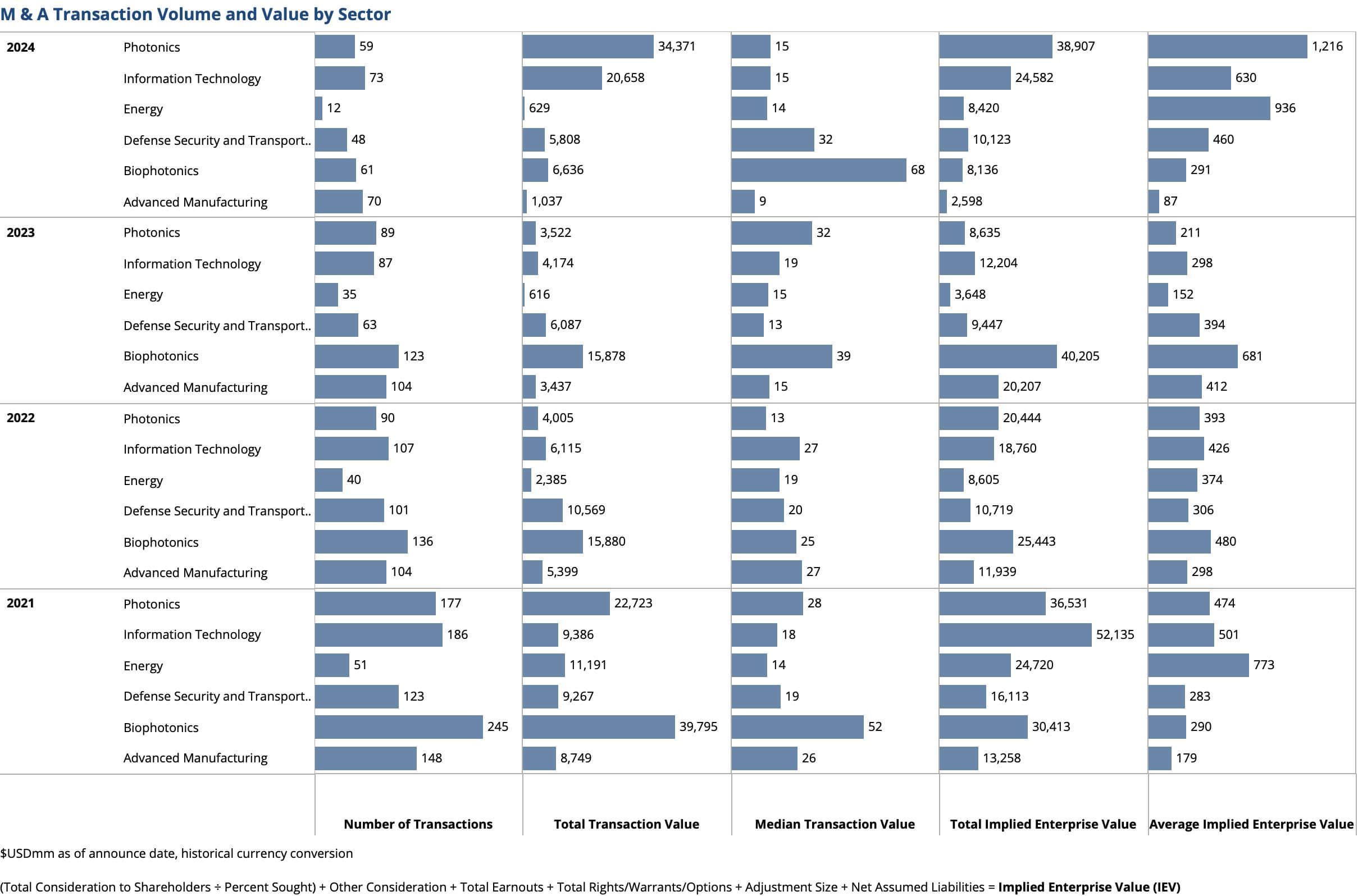 In the M&A market as a whole, strategic deals trade at the highest multiples in history across the board in 2021 with the decreasing valuations in 2023 continuing into the first half 2024. Many generalist analysts predict valuations to stabilize here with a new normal of higher interest rates and geopolitical instability. Based on researched transactions for targets with photonics technology, 2021 was also a banner year, but in contrast with the M&A market as a whole, strategic deals continue to trade relatively high for photonics targets.