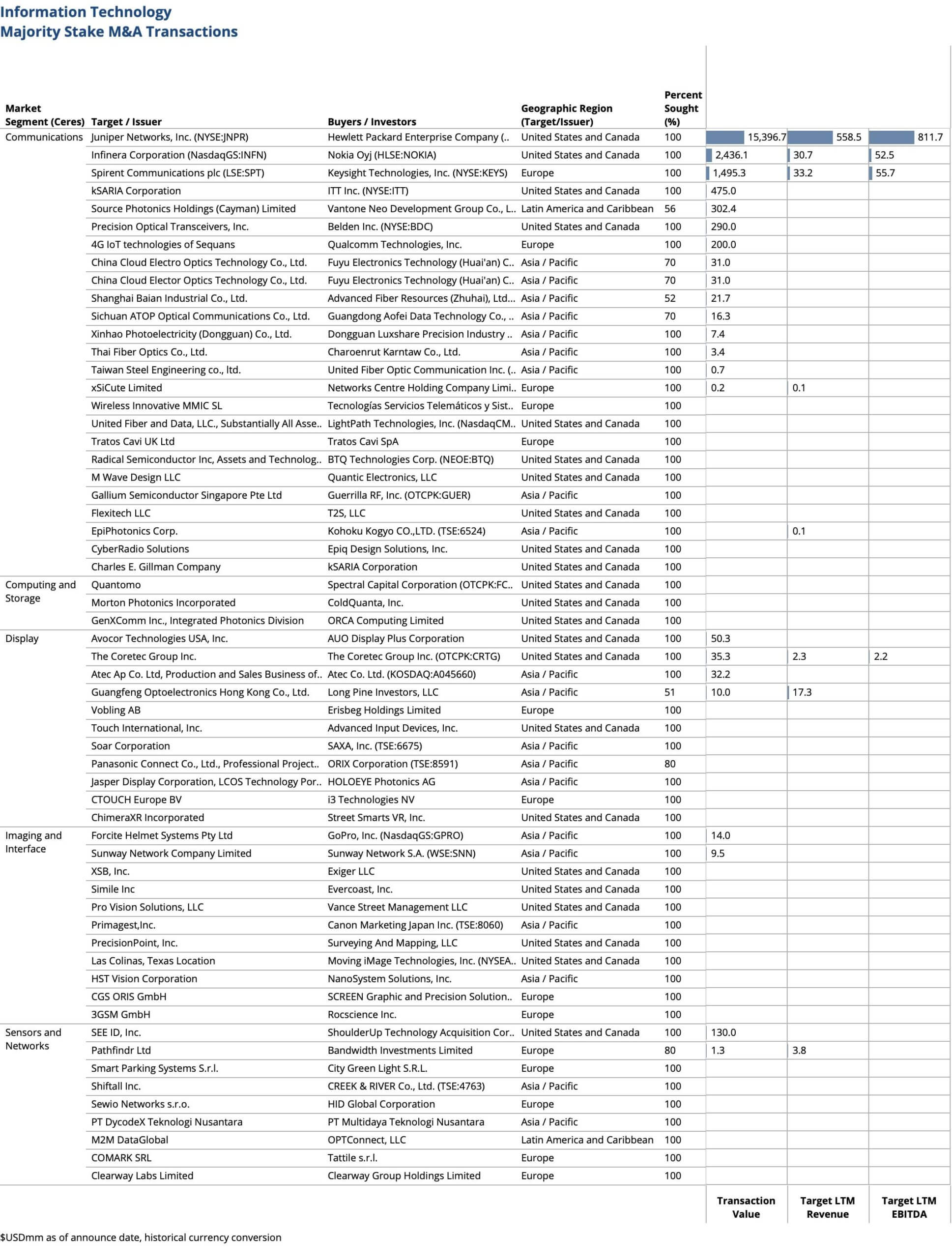 Total value tops $1B for additional eight transactions, including Nokia Oyj $2.4B acquisition of Infinera Corporation, supplier of optical access to long haul networking gear and CoStar Group $2.0B acquisition of Matterport, Inc., pioneer of LiDAR and AI based digital twin technology.