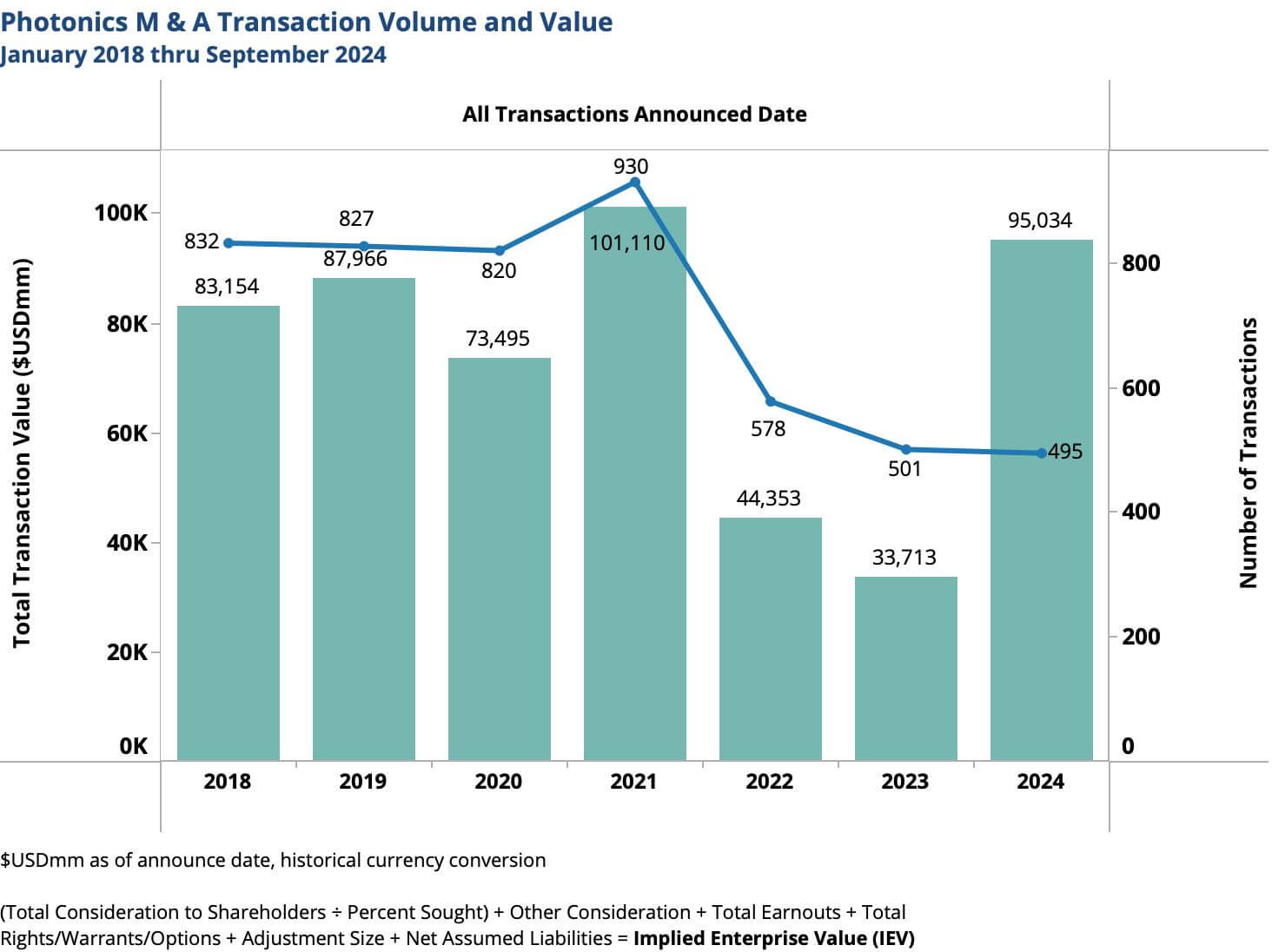 There remains uncertainty in the global M&A market as deal volume and total deal value recover from the record lows of 2023. M&A activity for targets employing photonics technology, however, appears to be on a steep upward trajectory in 2024.