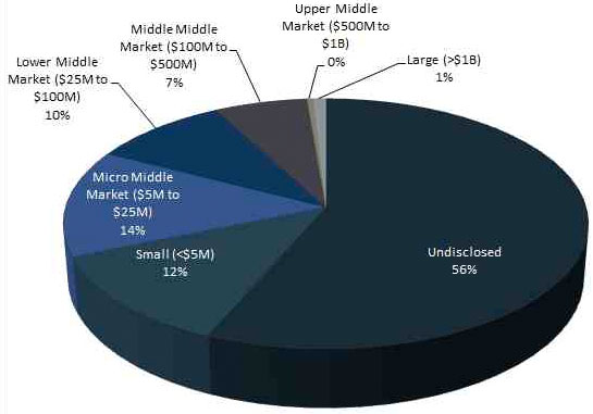 43% of researched transactions disclose the transaction value. Of those disclosed, greater than 80% are small market (<$5M), micro middle market ($5 to $25M), and small/middle market ($25 to $100M).