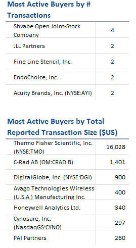 The Medical Imaging, Medical Diagnostics, Display, Communications, Metrology for Advanced Manufacturing, and LED Luminaires segments saw the most activity in volume of transactions.